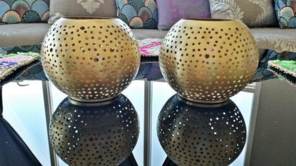 These 2 PC Moroccan Metal Candle Holders made in Morocco has a metallic gold, and copper inside. The outside has a dazzling design that catches the light of the candle and reflects it for a beautiful effect.